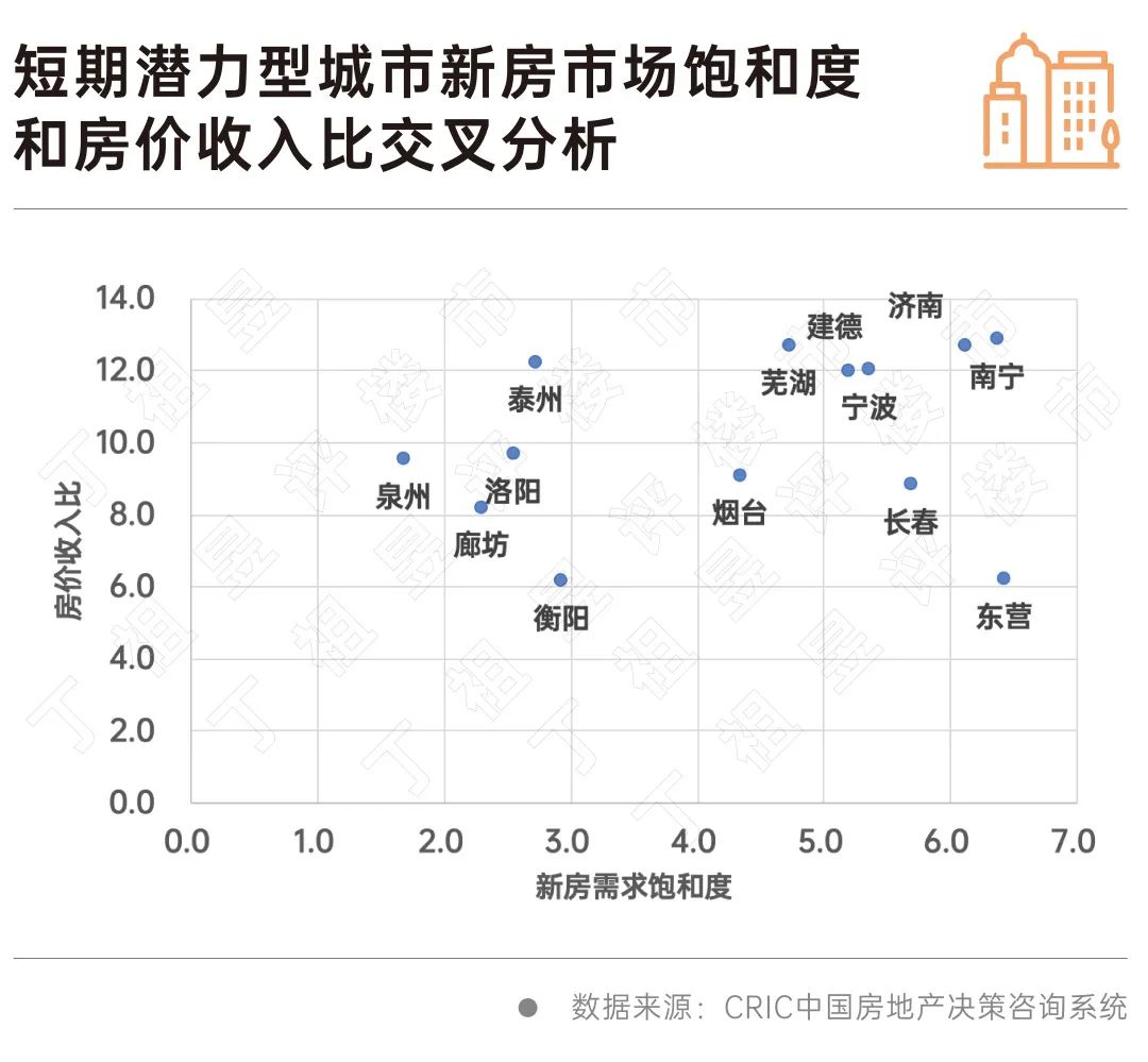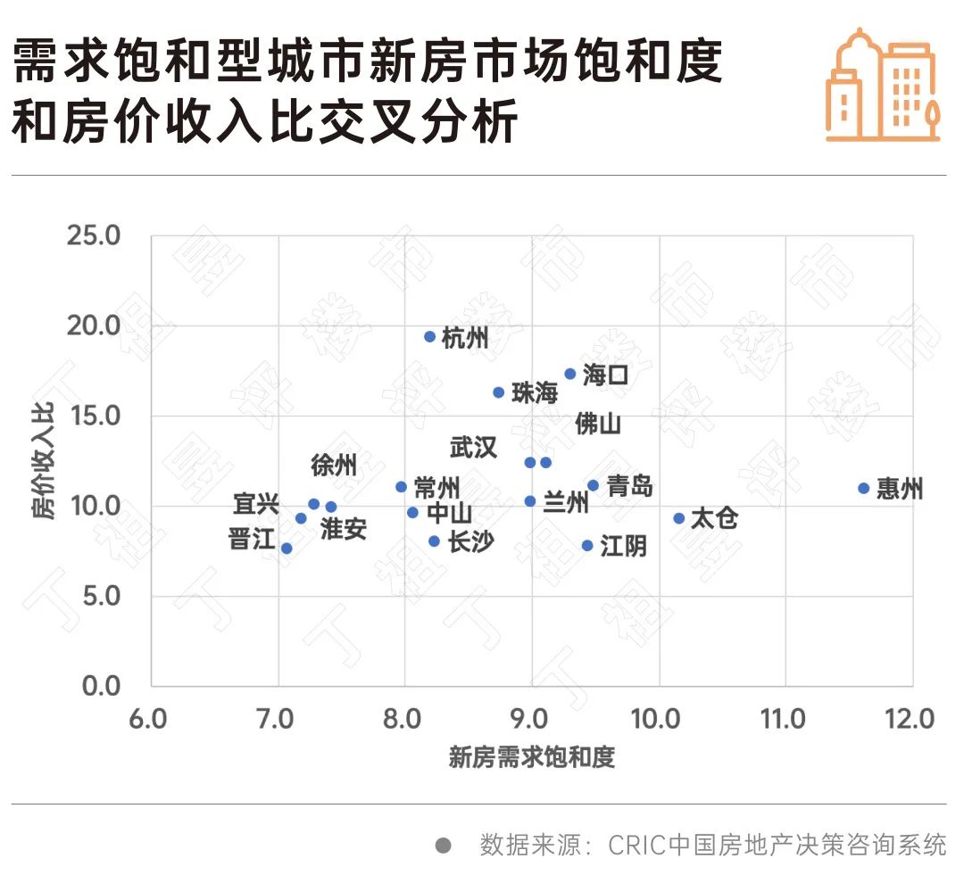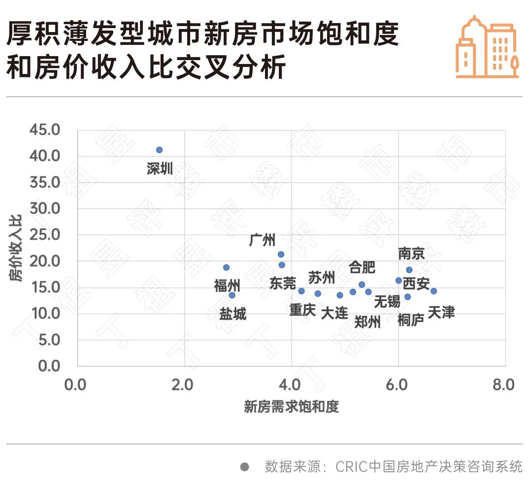 一个城市有能力买房,我们主要是测度各城市居民整体收入水平与当前房价是否匹配,以房价收入比来排序,可以看出,深圳、广州、杭州位列“前三甲”,深圳领先,房价收入比高达41年,高端购买力支撑起深圳的新房市场,而广州、杭州、东莞、福州、南京房价收入比基本也在20年左右,买房难度相对较大。 与之形成项目对比的是,衡阳、东营、晋江、江阴、长沙、廊坊、长春等整体房价处于较低水平,房价收入比均在9年以下,买房相对容易,后市只要行情有所起色,购房者以当前收入完全有能力买房入市。 将人均购房面积和房价收入比两个指标交叉分析,可以得到:需求是前提,有需求的城市未来楼市增长空间更大,而有能力则是必要条件,决定了成交何时能迎来集中爆发,因而按照这两大维度,我们可以将45个重点城市分为以下几类: 1、短期潜力型:芜湖、洛阳等内生型城市和“藏富于民”宁波仍有机会 我们筛选了新房市场饱和度(人均住宅购入面积)低于7平方米和房价收入比低于13年的城市,这类城市的突出特点为住宅需求相对旺盛,房价偏低,目前主要是购房者观望情绪严重,短期内入市热情并不高涨。典型代表为衡阳、东营、廊坊、长春、烟台、泉州、洛阳、建德、宁波、泰州、济南、芜湖、南宁。 结合周期波动规律,这其中除了南宁、烟台、泉州处于下行期之外,余下多数城市基本都处于平稳期或者低位徘徊期,整体成交规模相对固定,芜湖、洛阳等算是典型的内生型城市,宁波藏富于民,购买力“两极分化”严重,刚需乏力,改善观望是其目前项目去化率节节回落的主要原因。而廊坊等环京城市得益于交通发展提速,人口外溢加剧,随着北京城市副中心向通州转移,未来成交仍处在一定的释放空间。 2、厚积薄发型:广深宁苏庐等短期房价过高,中长期仍具成长空间 我们筛选了新房市场饱和度(人均住宅购入面积)低于7平方米和房价收入比高于13年的城市,这类城市的突出特点为住宅需求相对旺盛,但房价偏高,短期购买力有见顶征兆,不过考量到其人口优势,等待需求修复之后,未来成交规模尚有释放空间。典型代表为桐庐、大连、盐城、苏州、郑州、无锡、天津、重庆、合肥、西安、南京、福州、东莞、广州、深圳。 结合周期波动规律,这其中除了西安、大连处于下行期之外,余下多数城市基本都处于平稳期或者低位徘徊期,值得关注的当属广州、深圳、南京等核心一二线城市,整体市场尚属于上行期,年成交规模呈现出“U型”或“类U型”走势,成交集中爆发之后,短期内难免面临阶段性瓶颈,不过考量其城市基本面较佳,人口吸附力较强,未来楼市成交规模还是具备一定的成长空间。 3、需求饱和型:太仓、珠海、惠州等环核心城市或将面临更长调整 我们筛选了新房市场饱和度(人均住宅购入面积)大于7平方米的城市,这类城市的突出特点为住宅需求相对饱和,对于这类城市而言,房价并不是决定居民购买的主要因素,决定因素为常住人口基数较低,若未来无外来投资投机需求加持,短期内成交难有起色。典型代表为典型代表为晋江、宜兴、淮安、中山、长沙、江阴、太仓、徐州、常州、兰州、武汉、佛山、青岛、惠州、杭州、珠海、海口。 结合周期波动规律,这其中徐州、兰州整体呈现出节节攀升走势,但基本也属于“强弩之末”,杭州、太仓、珠海等楼市呈现出典型的投资性驱动特征,太仓主要承接上海外溢需求,珠海主要是粤港澳大湾区政策利好和港珠澳大桥落成吸引了全国范围内投资客入场,而杭州更多依托于“城运”,G20峰会、亚运会等政策加持促使投资、改善需求集中进场,也使得杭州楼市呈现出明显的“U型”特征,对于这类楼市而言,短期内整体市场趋于理性,购房更多集中在自住,投机需求退潮对于本地楼市未来增长还是存在一定程度的负面影响,因而未来整体成交增长的动能也在减弱。 而对于淮安、惠州、中山等需求趋于饱和且整体成交处于下行周期的城市,未来整体楼市成交难言乐观,筑底调整周期更长,3-5年或将逐步走出成交低谷。