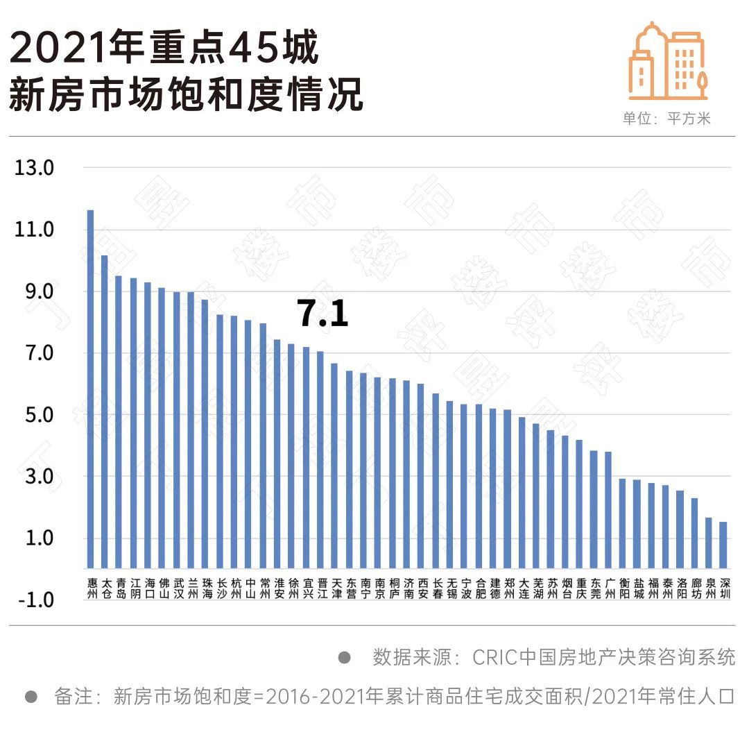 一个城市有多少人需要购房,我们主要是以当前各城市常住人口作为测算基础。按照2016年-2021年各城市累计商品住宅成交规模除以当前常住人口规模,可得到人均购房面积,以此作为楼市饱和度指标,可以看出,该指标越大,未来楼市可成交的增长空间便越小。 结果来看,惠州、太仓、江阴、佛山、珠海、中山、常州等排名靠前,这类城市基本为长三角、粤港澳大湾区核心三四线城市,经历了前几年房价飞涨、成交放量,短期内均面临需求见顶情况; 二是青岛、海口、兰州、长沙等弱二线城市楼市饱和度也相对较高,虽然同为省会城市,但人口基数较低,省内吸附力有限使得短期内人均购房面积相对也保持在较高水平。 三是成交短期低迷筑底类城市诸如深圳、广州、重庆、苏州人均购房面积均不足5平方米,这类城市主要受困于房价较高,城市常住人口层面对未来成交仍会构成一定的支撑; 四是还有部分都市圈边缘城市诸如泉州、廊坊、洛阳、泰州、盐城、衡阳等,楼市饱和度也相对较低,廊坊基本在2016年放量之后便进入调整周期,年成交规模多年来维持低位,依据购房需求而言,来仍存在一定的增长空间。