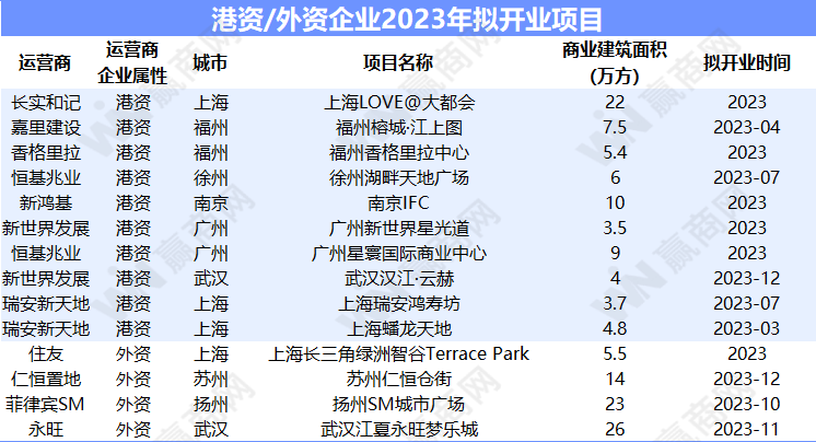 其中港资企业新鸿基、新世界、恒基兆业、长和、瑞安新天地、嘉里建设、香格里拉2023年将带来10个新项目开业,但太古地产、恒隆地产均无新购物中心入市。外资企业项目4个,来自SM、永旺、仁恒、住友4家企业。