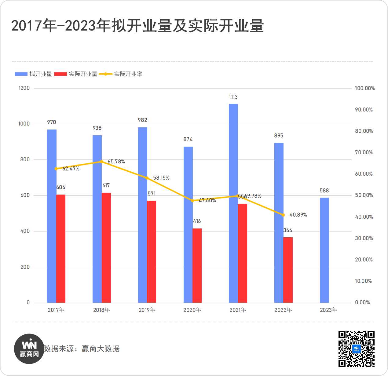 从过去6年的实际开业情况看,开业率一路走低,从疫情第一年开始,连续三年开业率低于五成。不过,2023年拟开业数量、体量约为2022年实际开业量的1.6倍,若开业能如期推进,全年增量仍然可期。(详情请阅读:同比减少近200个!2022年全国仅开业366个新mall)