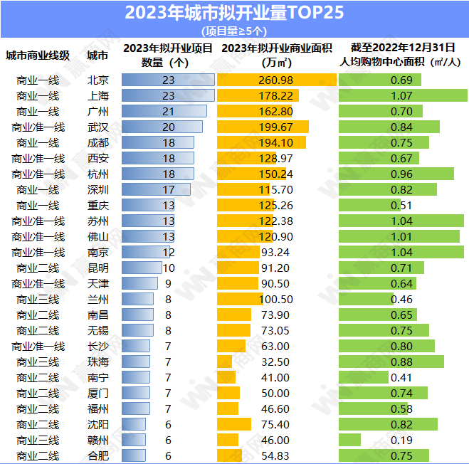 从城市角度来看,2023年拟开业量≥5个的城市共25个。北京跃升至第一,数量与上海并列第一,均为23个项目,但北京总体量超260万平方米,较上海多80余万平方米;广州第三,21个项目。