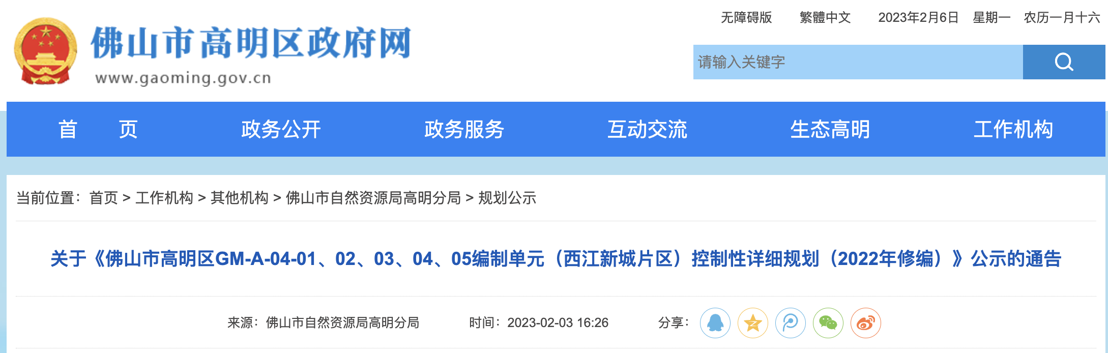 日前,高明区政府网站发布了关于《佛山市高明区GM-A-04-01、02、03、04、05编制单元(西江新城片区)控制性详细规划(2022年修编)》公示的通告,披露了高明西江新城的最新规划。