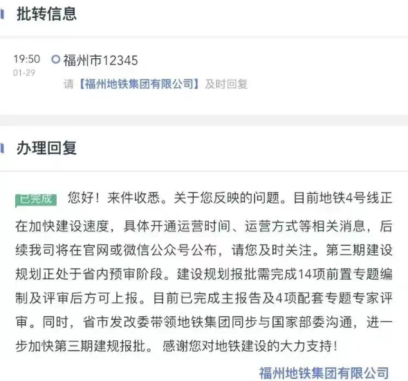 1月29日,福州地铁集团有限公司在回复网友提问表示:福州地铁第三期建设规划正处于省内预审阶段。建设规划报批需完成14项前置专题编制及评审后方可上报。目前已完成主报告及4项配套专题专家评审。同时,省市发改委带领地铁集团同步与国家部委沟通,进一步加快第三期建规报批。