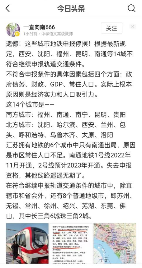 日前,有网友发帖称,根据最新规定,西安、沈阳、福州、昆明、南通等14城不符合继续申报轨道交通条件,申报停摆!