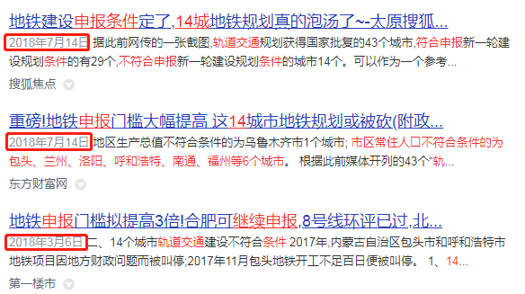 于此,我们看到关于城市地铁申报停摆消息,基本都来自2018年的报道。
