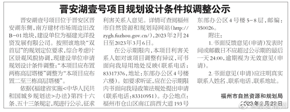 日前,福州市自然资源和规划局发布公示:按照该地块“双首层”的规划定位要求,综合考虑片区景观风貌协调,现建设单位申请规划设计条件调整:“本项目应布置两栋高层塔楼”调整为“本项目应布置二至三栋高层塔楼”!