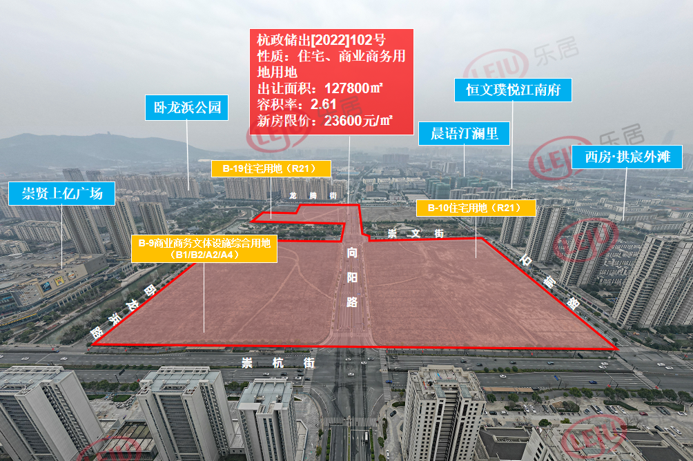 标的所提到的【崇贤核心B9】,即为崇贤花海地块中的B-9商业商务文体用地。地块东侧是上亿广场、南侧是崇文街、西侧是崇康路、北侧是崇杭街。