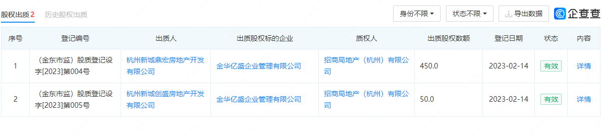 有趣的是,2月14日,通过股权出质的方式,招商局地产(杭州)有限公司成为金华亿盛企业管理有限公司的质权人,获得全部股权。