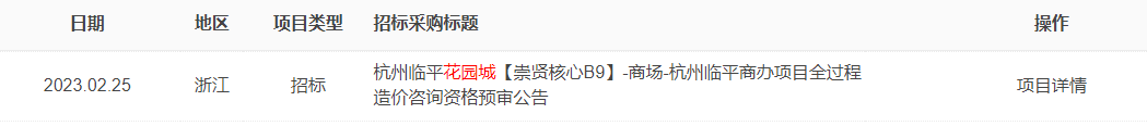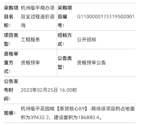 近日,有招标网上出现了不少崇贤花海地块的招标公告,最值得关注的是一份名为“杭州临平花园城【崇贤核心B9】商场-临平上班项目全过程造价咨询资格预审公告”。