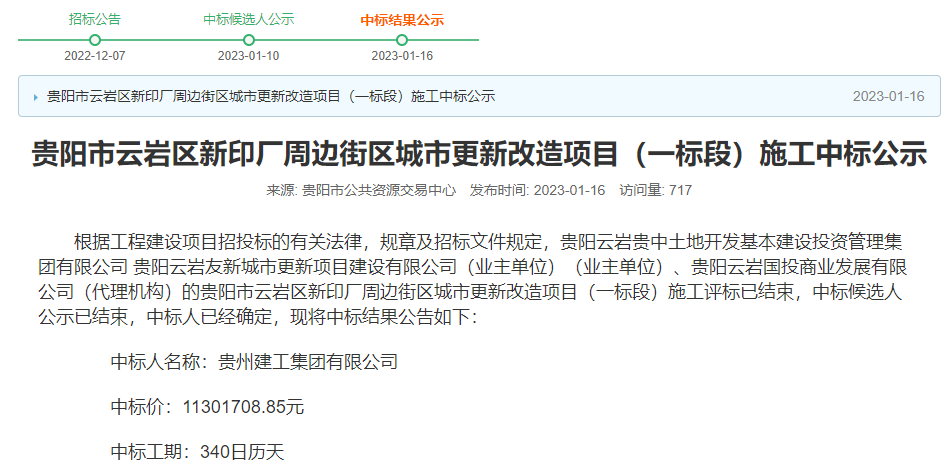 截至目前,新印厂周边街区城市更新改造项目已完成施工、监理、设计等多项招标工作,其中项目施工于2023年1月16日完成招标,中标人为贵州建工集团有限公司,工期340天。