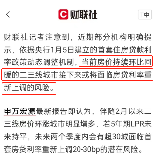 据财联社的消息,近期有部分机构明确提示,依据央行1月5日建立的首套住房贷款利率政策动态调整机制,当前房价持续环比回暖的二三线城市接下来或将面临房贷利率重新上调的风险。