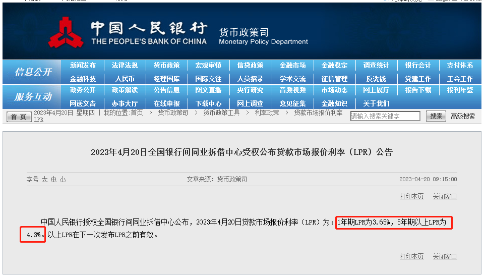 今天(4月20日)央行如期公布了新一期LPR,1年期为3.65%,5年期以上为4.3%,均维持不变。