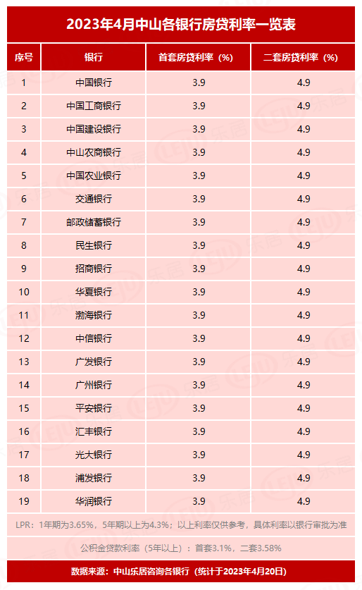 据了解,目前,中山19家银行首套最低利率基本都按3.9%执行。