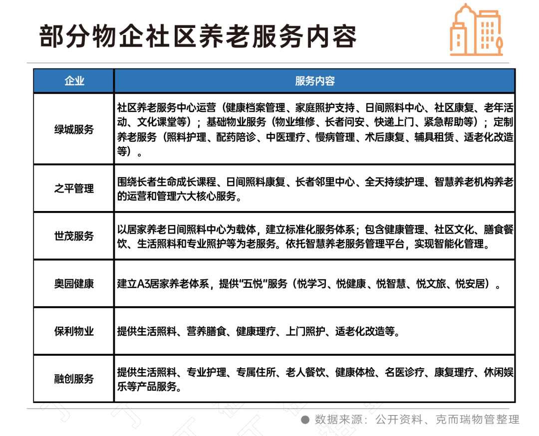 公开资料显示,物企布局社区养老主要包含助餐、助洁、助浴、助急、助行、助医、代办、日间照料、精神关爱、健康护理、适老化改造等11类服务,其中日间照料、健康护理是社区养老集中布局业务之一。