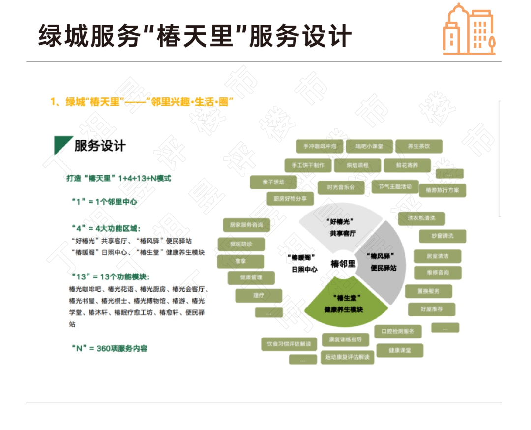 目前有14家上市物企布局社区养老,多家企业已形成明确的产品线、服务的颗粒度也逐步细化。如绿城服务社区养老服务已形成椿天里产品线,打造了 “1+4+13+N”模式,即1个邻里中心,4大功能区域,13个功能模块,360项服务内容。