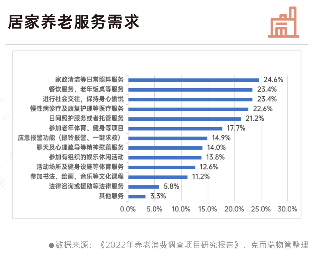 从老人的需求来看,五项内容中除了医疗服务、日间照护服务两项相对需要专业人士提供外,其余三项内容均相对基础,更偏向于家政的服务范畴。