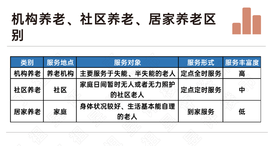 从服务内容丰富度和服务深度来看,机构养老大于社区养老大于居家养老。也就是说,只要能力许可,一家机构可以同时从事机构养老、社区养老和居家养老三类服务。