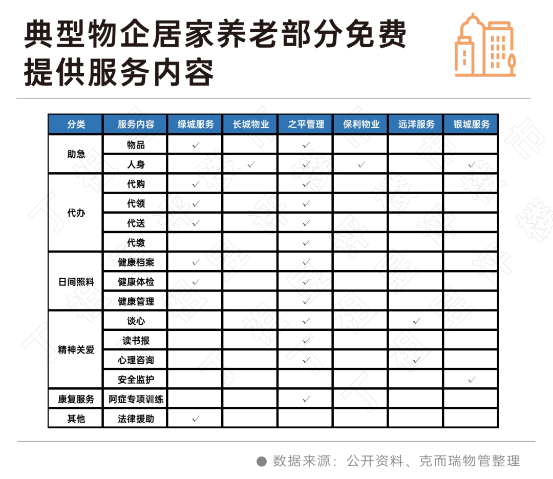 根据物企布局社区居家养老的深度,我们选取了绿城服务、长城物业、之平管理、保利物业、远洋服务、银城服务等6家在养老服务方面探索较为靠前的企业作为样本进行拆解,从10大维度、40多个服务内容,看看物业服务企业在社区养老、居家养老领域的布局现状。