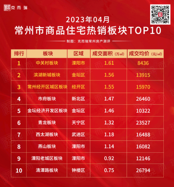 4月常州市商品住宅热销板块中,排在榜首的是溧阳的中关村板块,4月成交了1.61万㎡,成交均价8436元/㎡。