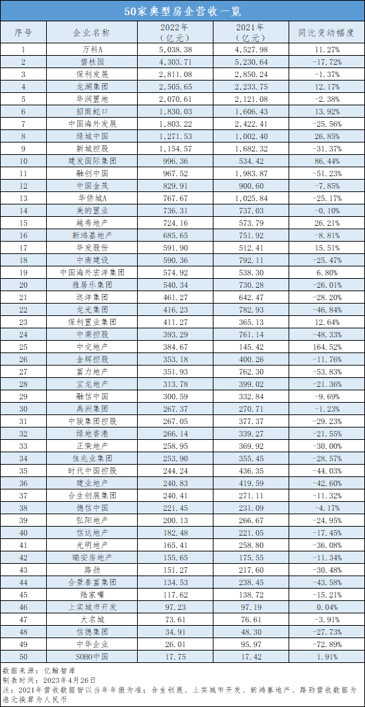 2022年,上述50家样本房企共计实现营收约37797亿元,较上一年的42272.5亿元下滑了10.6%左右,其中共有9家房企营收过千亿,同比减少3家。