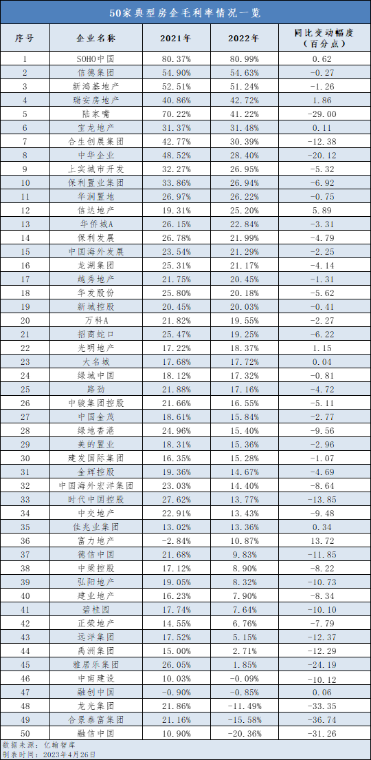 利润下滑、亏损成为常态也意味着行业的盈利空间在进一步收窄。2022年,50家样本房企的毛利率平均值约18%,而该指标在2021年为25%,相差约7个百分点。