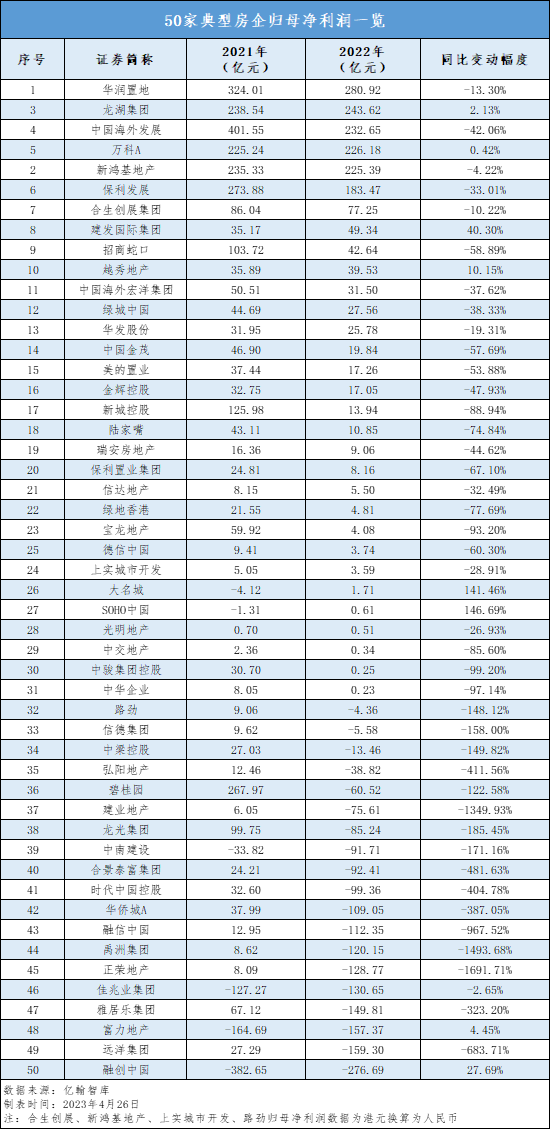 同比跌幅在100%以内的有26家房企,佳兆业、华润、保利、绿城、中海、招商蛇口、新城均在这一梯队。不过,除佳兆业之外,该梯队中的其他企业都实现了归母净利润为正,前者2021年归母净利润亏损127.27亿元,2022年亏损进一步扩大至130.65亿元。