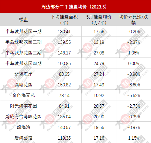 挂盘均价最低的金色海琴苑,5月均价也达到了接近11万/平;部分挂盘均价高的楼盘如翡翠海岸、半岛城邦花园三期,均价超过27万/平。