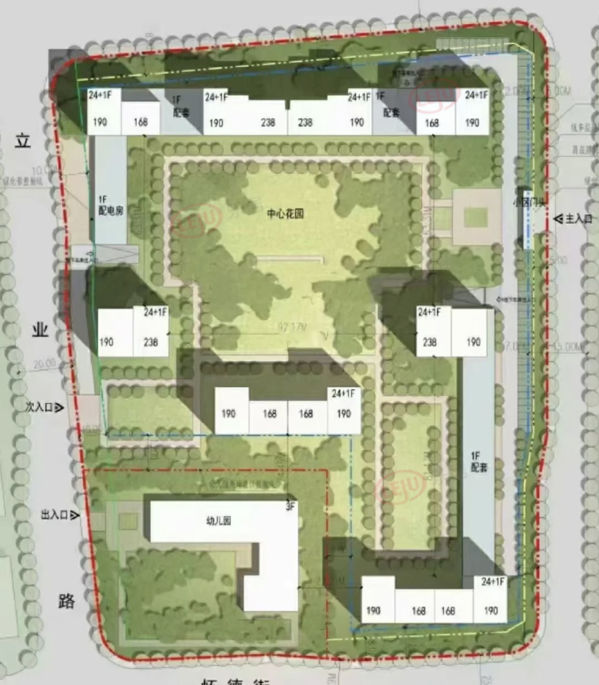 项目自带的幼儿园位于西北角,园区内规划有中心花园,主入口位于东侧规划道路,次出入口位于立业路。