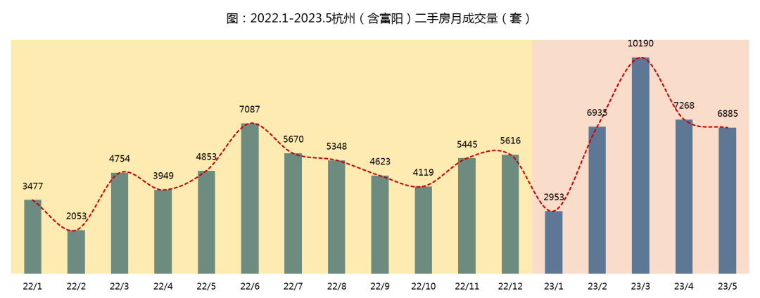 近日,根据我爱我家数据,5月杭州全市(含富阳)二手房共成交6885套,相较4月7268套,环比下跌5.27%。