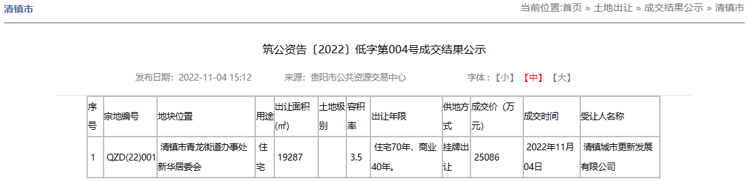 据悉,清镇市三角花园片区城市更新改造项目—6号地块(QZD(22)001)于2022年11月4日被清镇城市更新发展有限公司以25086万元摘得。地块规划容积率不小于1.0,不大于3.5;建筑密度不大于55%(居住建筑密度不大于22%);绿地率不小于10%;建筑限高不高于100米。