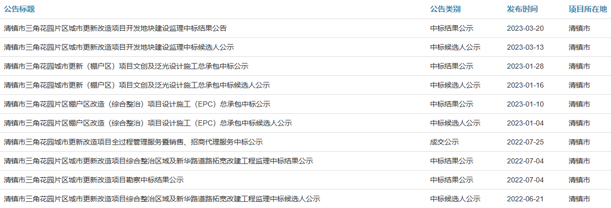 截止目前,清镇市三角花园片区城市更新改造项目已完成项目开发地块建设监理、项目文创及泛光设计施工总承包、(综合整治)项目设计施工(EPC)总承包等招标工作。并且完成了部分改造。