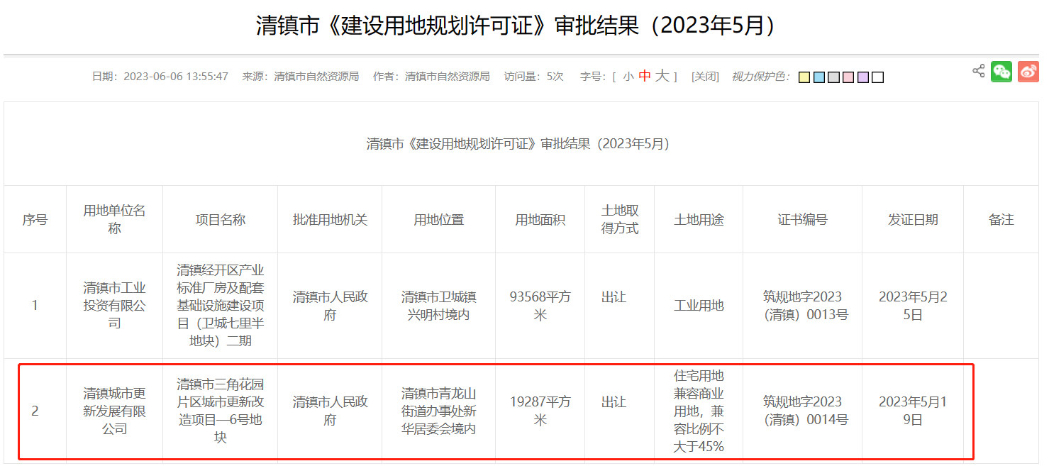 乐居新媒体 贵阳近日,根据清镇市自然资源局发布的清镇市《建设用地规划许可证》审批结果(2023年5月)显示,清镇市三角花园片区城市更新改造项目—6号地块已在2023年5月19日获得建设用地规划许可证。