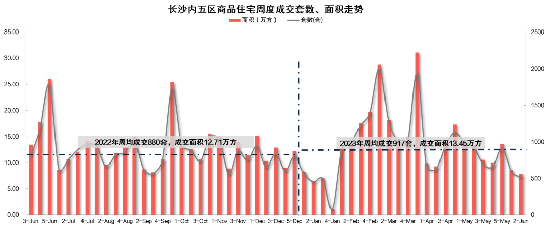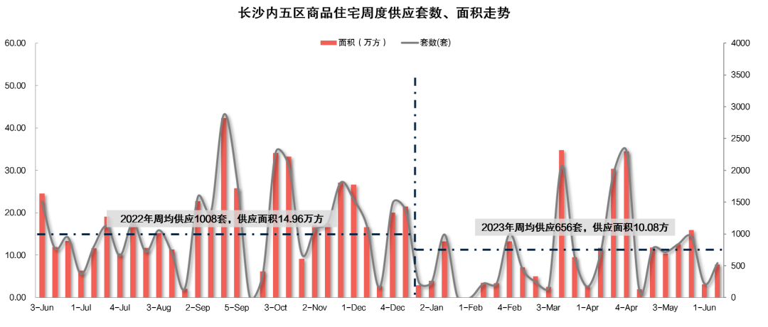 新房市场方面,2023年6月第3周长沙内五区一手住宅成交513套、7.86万方,环比分别下滑14%、8%。供应上,一手住宅供应542套、7.75万方,环比分别上涨151%、149%。
