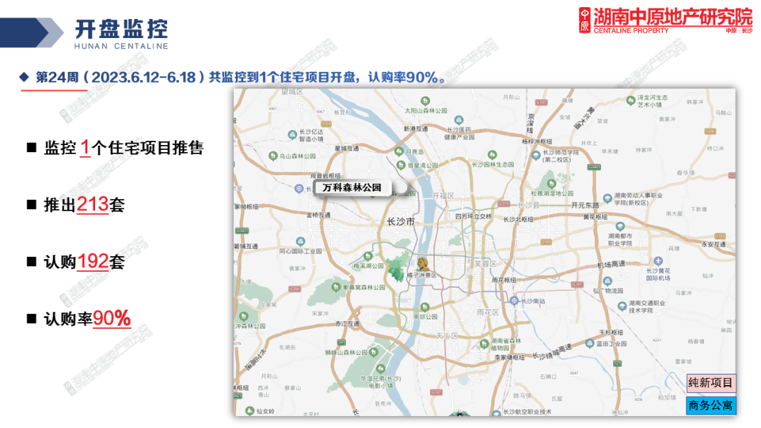 开盘动态方面,上周湖南中原研究院共监控到长沙1个项目集中开盘,为万科森林公园,共推出213套,认购192套,认购率90%。