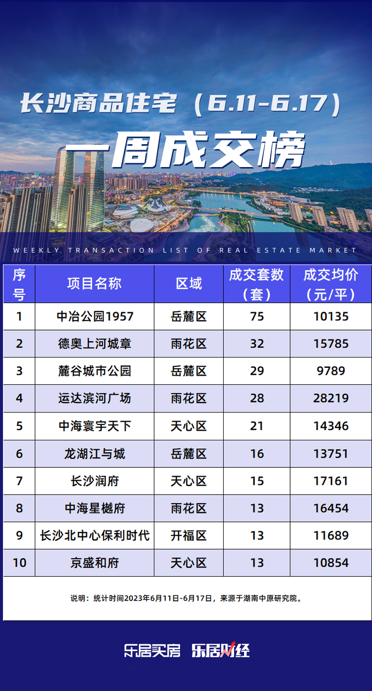 其中位于榜单前三位的分别为岳麓区的中冶公园1957、雨花区的德奥上河城章、岳麓区的麓谷城市公园,分别成交75套、32套、29套,成交金额分别为0.91亿、0.73亿、0.35亿。