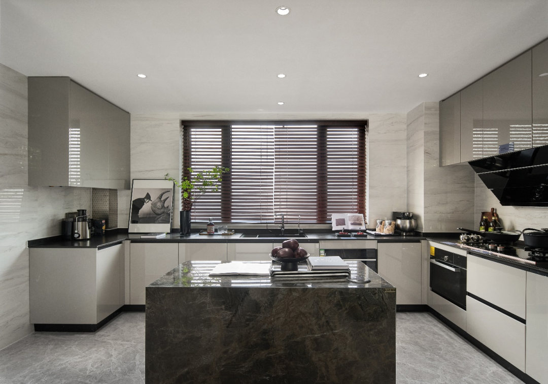一方面,U型厨房+岛台在造型美观、尺度更阔绰的同时,形成一个洄游空间,其开放式设计增强了空间流动性,与餐、客厅更好地互动,动线更流畅,下厨不再“孤独”,方便做饭的同时与家人沟通交流,凸显一体化优势;