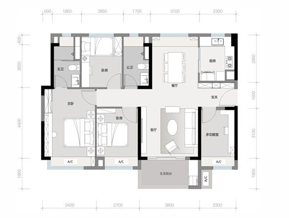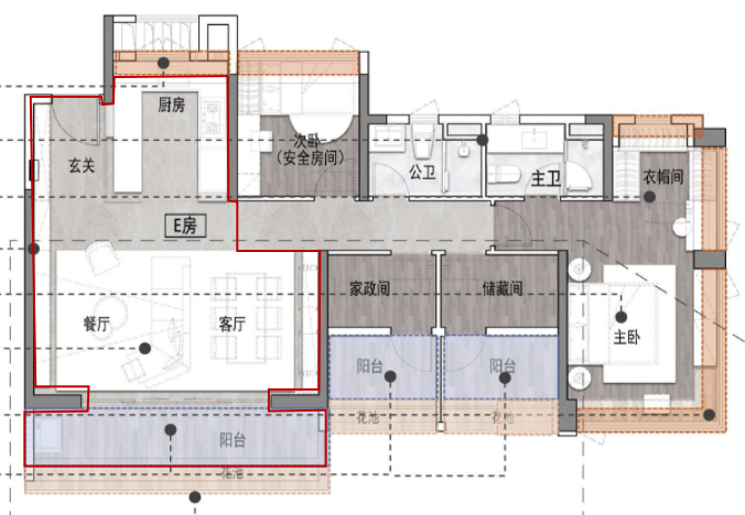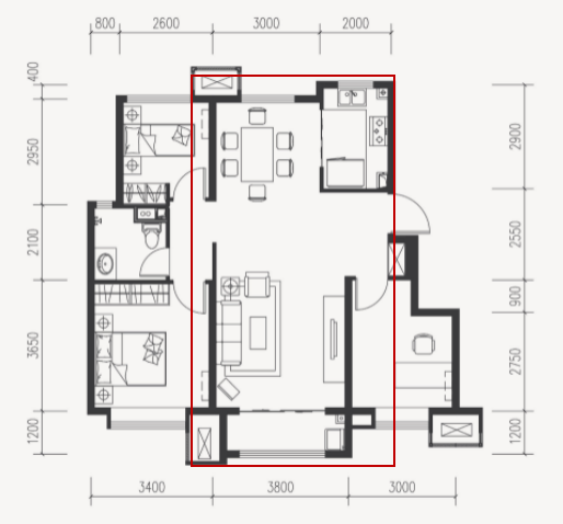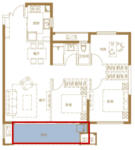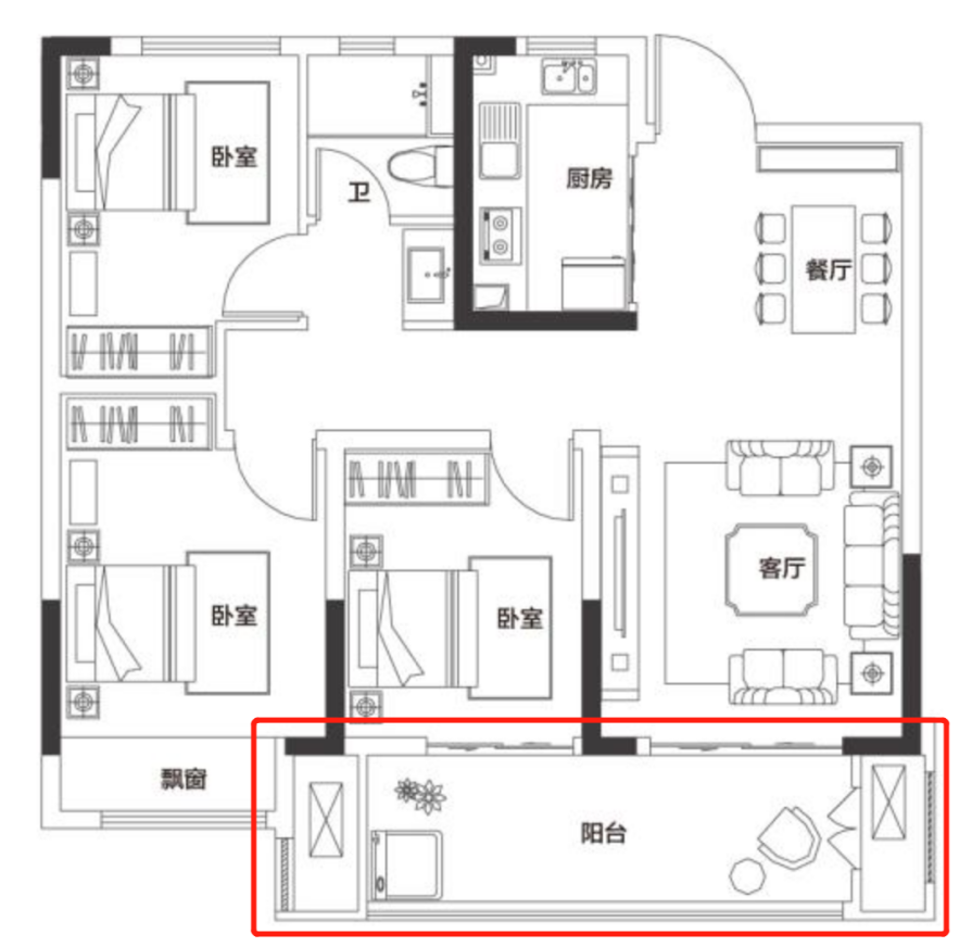 为了进一步增加客餐空间的尺度感,阳台空间常常被纳入到客餐空间中,尤其对于刚需产品来说,1.8米进深阳台常常为产品主打亮点。