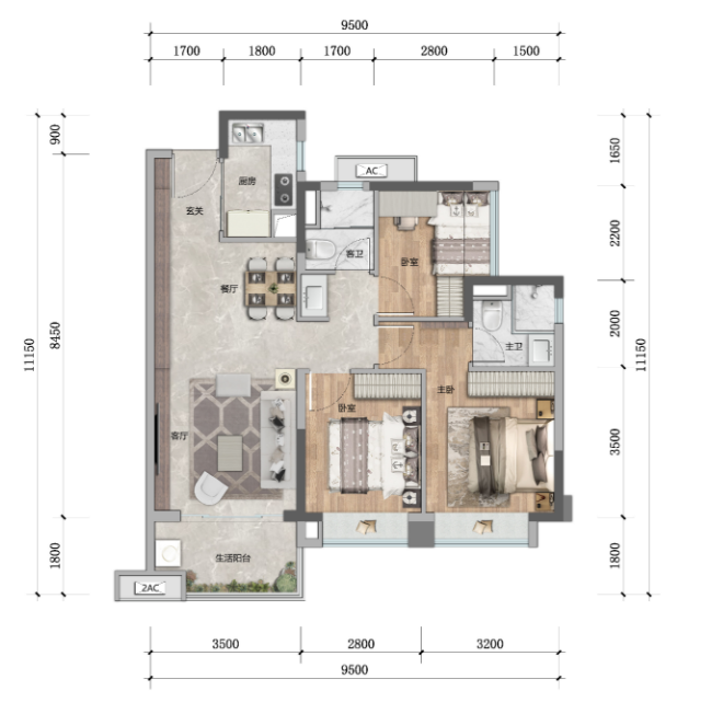 如刚需项目保利越秀金茂松湖云禧95平米户型,设计了经典LDK格局,在扩大空间尺度的基础上,考虑到刚需客群对于收纳的基础性需求,设置了超长收纳空间,通过互换了客厅沙发与电视墙的位置,有长8.2米的一整面的收纳,分为玄关柜、餐边柜、客厅收纳柜,总共有6.66立方,相当于66个28寸的行李箱,展开相当于19平米的房间。