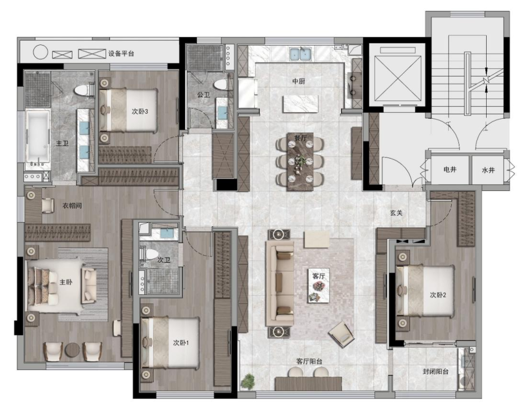 南北双阳台配置,能够实现一侧观景,一侧家政料理,互不干扰,保持观景休憩、家政生活各自的纯粹性。如俊发·龙泉俊园215平米户型,南向客厅阳台约8米宽,可满家庭活动需求;北阳台进深1.1米,兼具晾晒与餐厅采光功能。南北双阳台的设置,气流可以穿堂而过,通透升级。