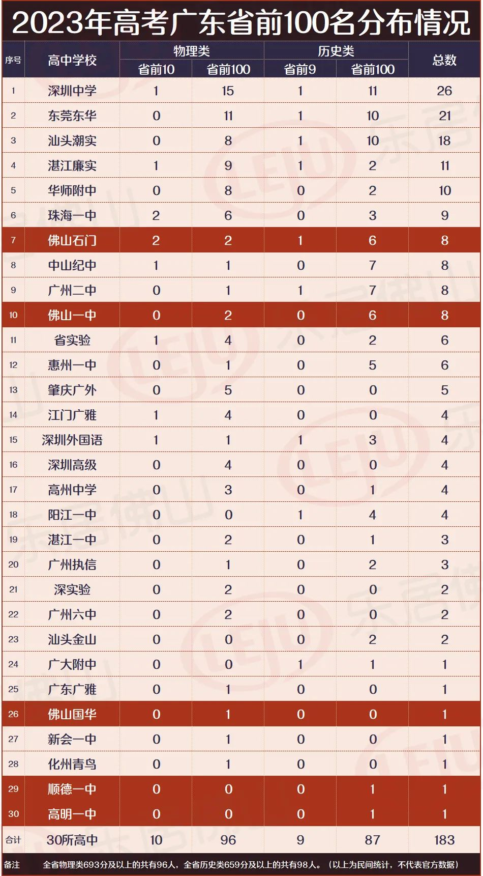 其中,佛山有5所学校上榜,分别是石门中学、佛山一中、国华纪念中学、顺德一中和高明一中,合计19人冲进省前100名,石门中学、佛山一中各占了8人。