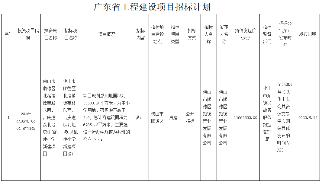 广东顺控北滘地块配建学校,该地块于去年12月以近24亿总价拍出,须配建1所42班的公办小学,规划总用地面积为33530.60平方米,目前项目已发出了设计招标计划。