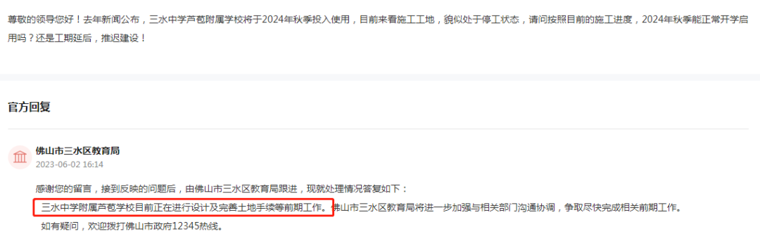 而根据三水区教育局最新回应,三水中学附属芦苞学校目前正在进行设计及完善土地手续等前期工作。