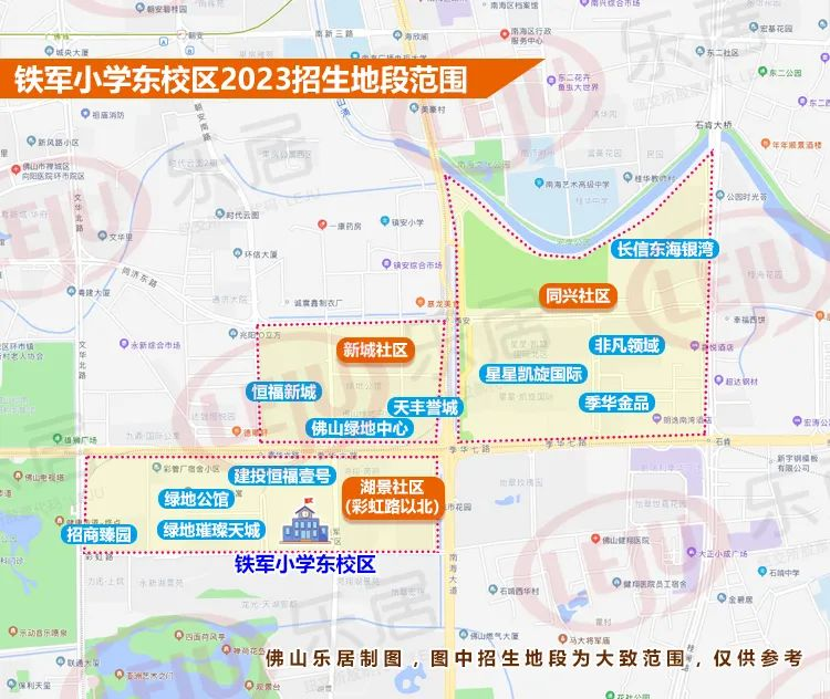 根据2023年禅城公办招生地段划分方案,铁军东校区对口新城社区、同兴社区和湖景社区(彩虹以北)。