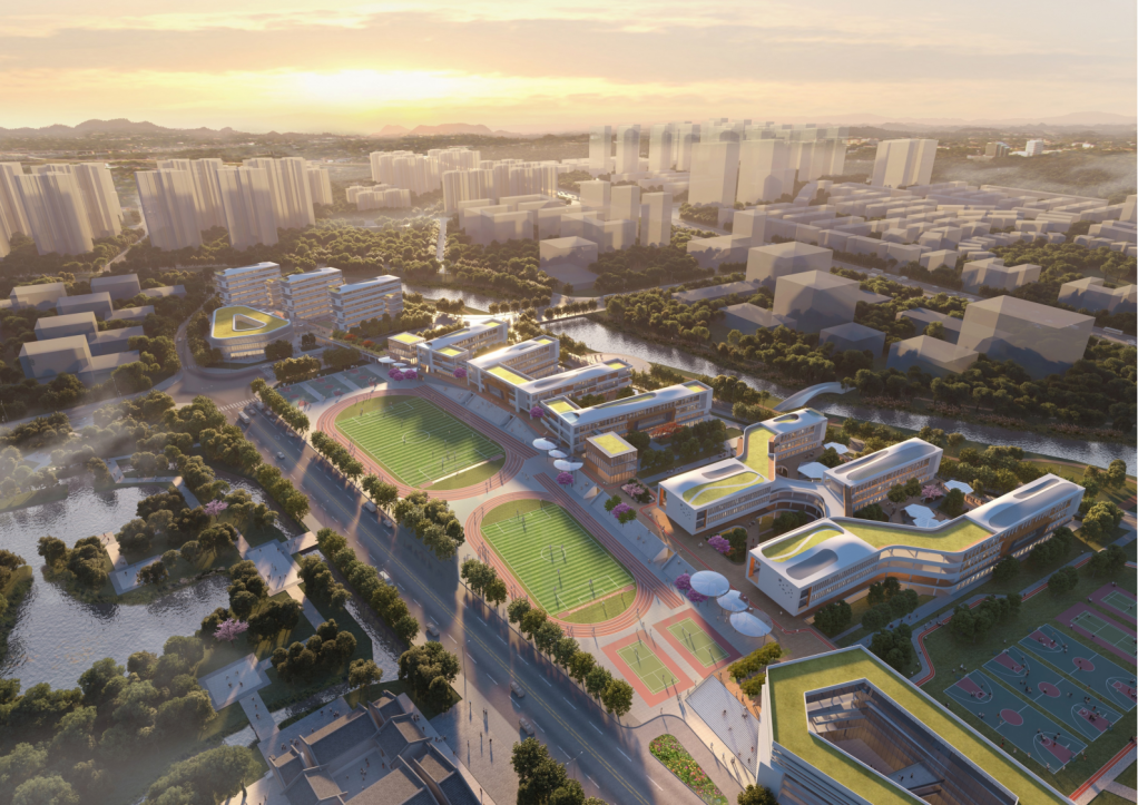 佛山新城未来学校位于顺德区乐从镇小布村,华发滨江府旁,占地36984.48㎡,规划按设计36个班,办学规模为1620人,预计将在2026年投入使用。近来敲定概念设计方案,目前仍在进行深化设计。