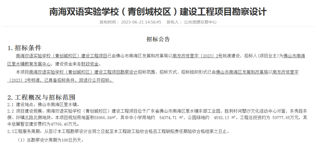 6月21日,乐居从佛山市公共资源交易中心中获悉,南海双语实验学校(青创城校区)建设工程项目勘察设计正在招标中,项目已由佛山市南海区发展和改革局批准建设。