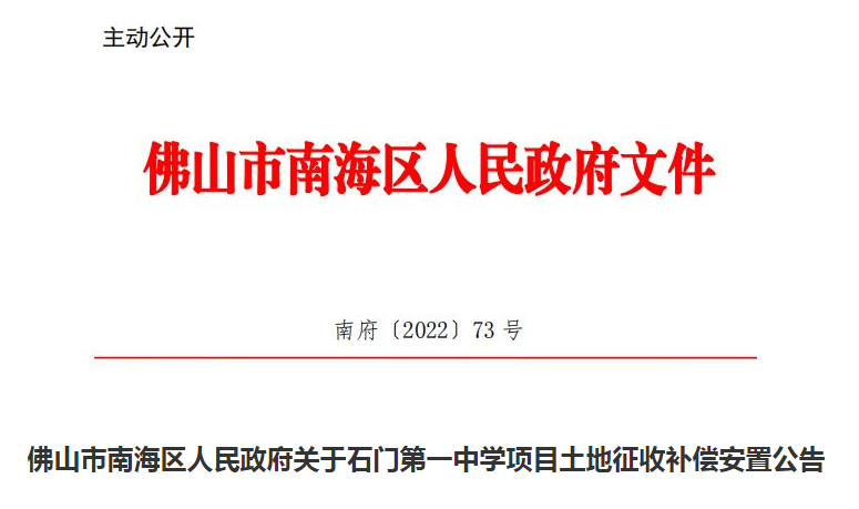2022年5月,南海区人民政府发布了《关于石门第一中学征收土地预公告》和《关于石门第一中学配套道路征收土地预公告》,拟征收土地面积约179.81亩,目的用于石门第一中学建设。