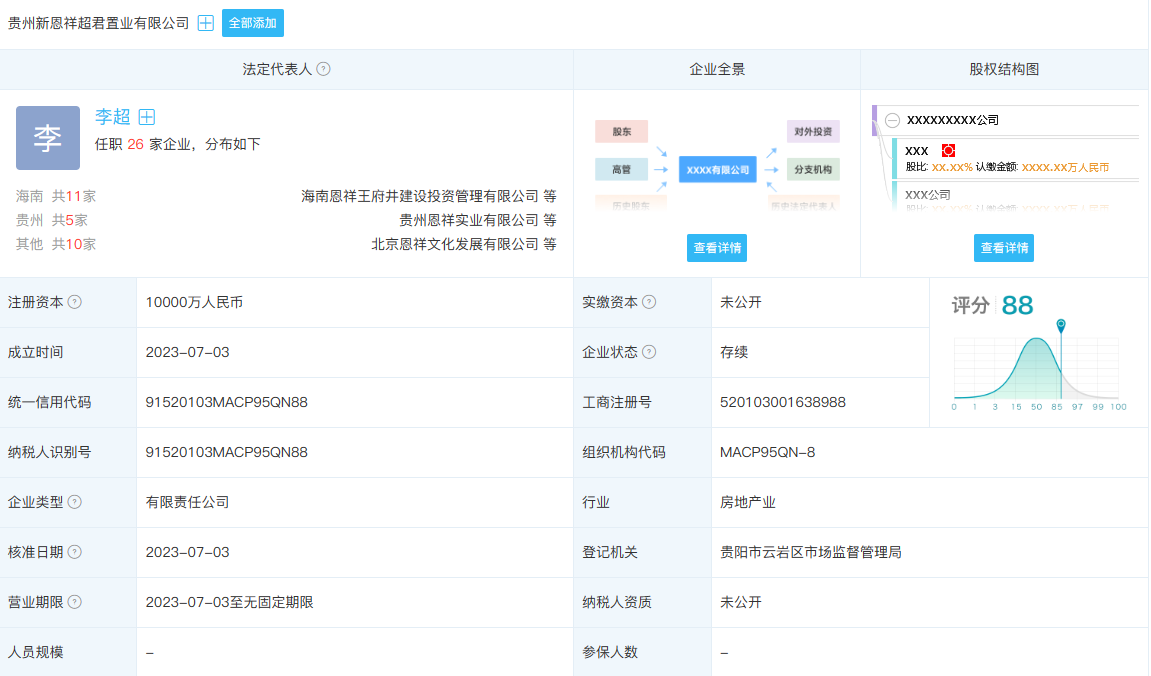 根据天眼查信息显示,李超也担任海南恩祥房地产开发有限公司和贵州恩祥置业有限公司法人。也就是说贵州新恩祥超君置业有限公司与恩祥集团关联度极高。
