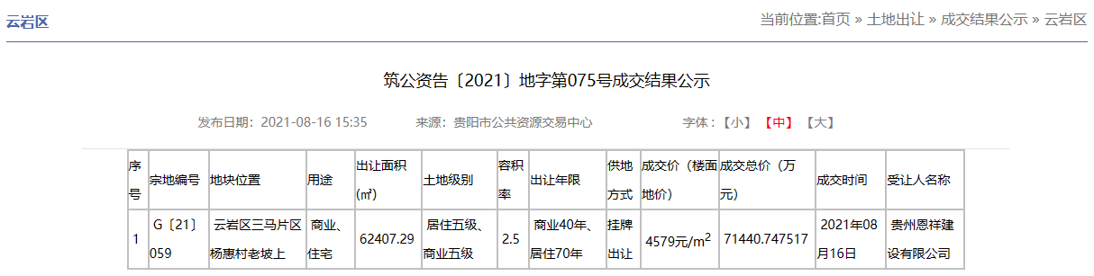 在2021年7月29日恩祥集团与万科(大股东)合资成立贵州恩祥建设有限公司,并以总价7.14亿元、楼面价4579元/㎡摘得三马片区杨惠村的G〔21〕059号商业、住宅地块。目前该地块已打造成为万科·观山甲第项目。