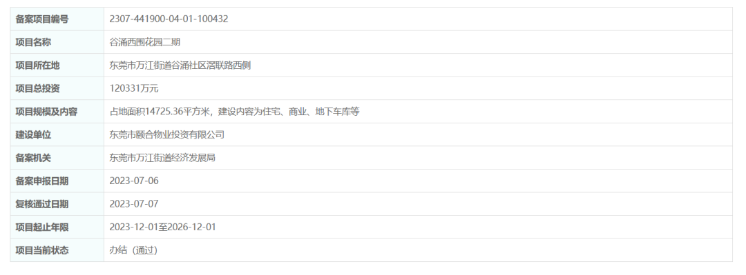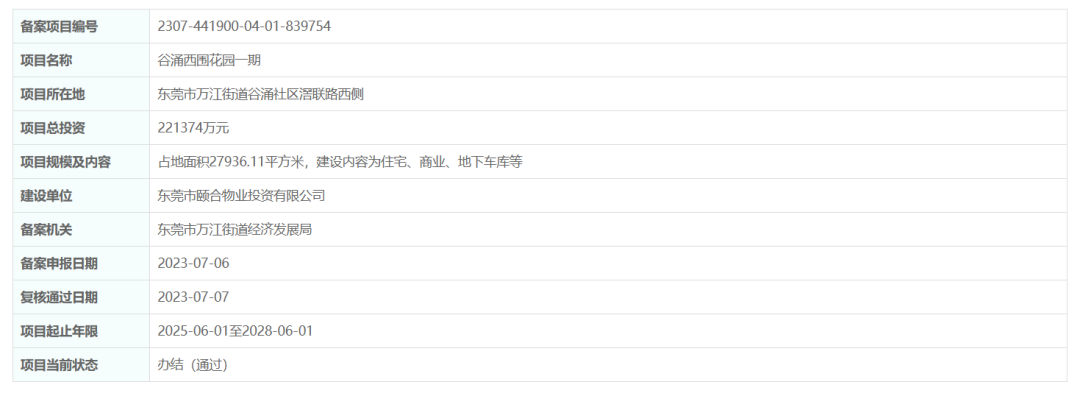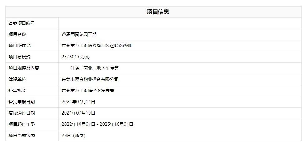 据广东省投资项目在线审批监管平台显示,7月7日,谷涌西围花园一期、二期成功备案,两期投资金额约34亿元。