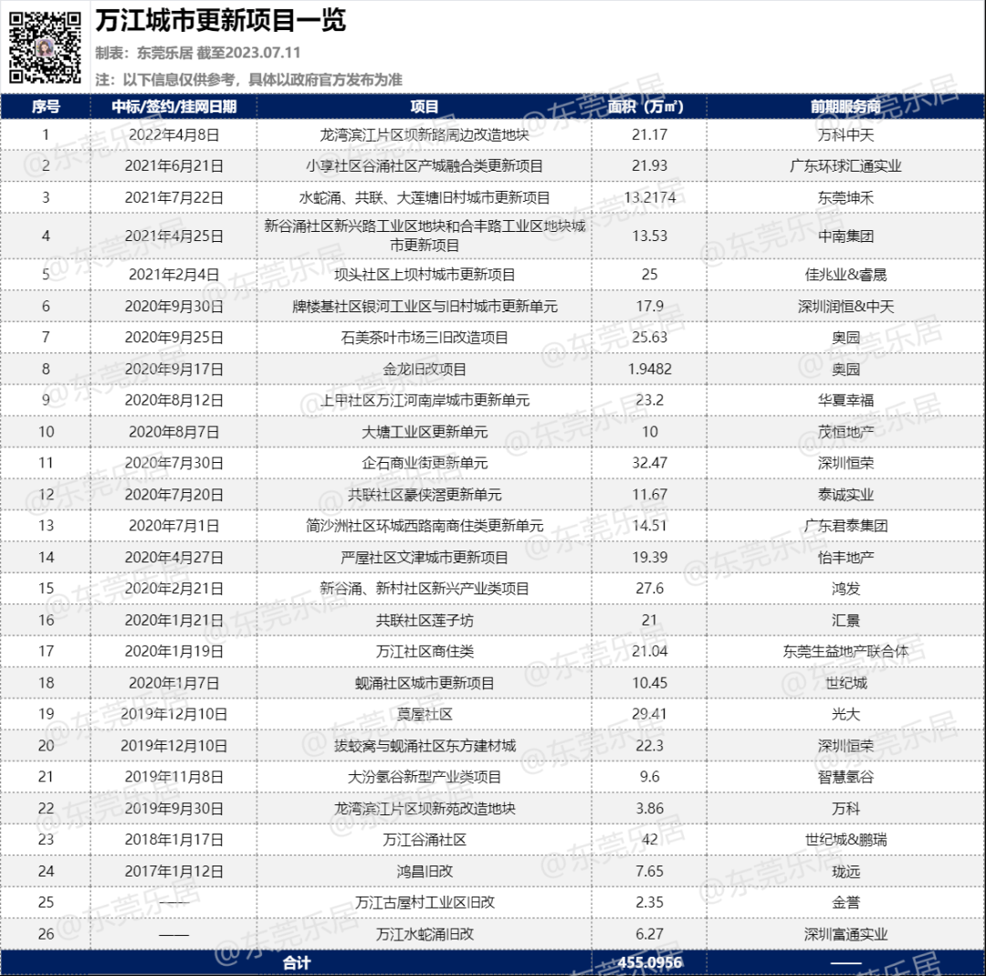 据不完全统计,万江目前已中标的旧改项目多达26宗,总占地面积约455.1万㎡,改造方向以商住功能为主,吸引了万科、中天、鹏瑞、光大等知名房企抢滩入驻。